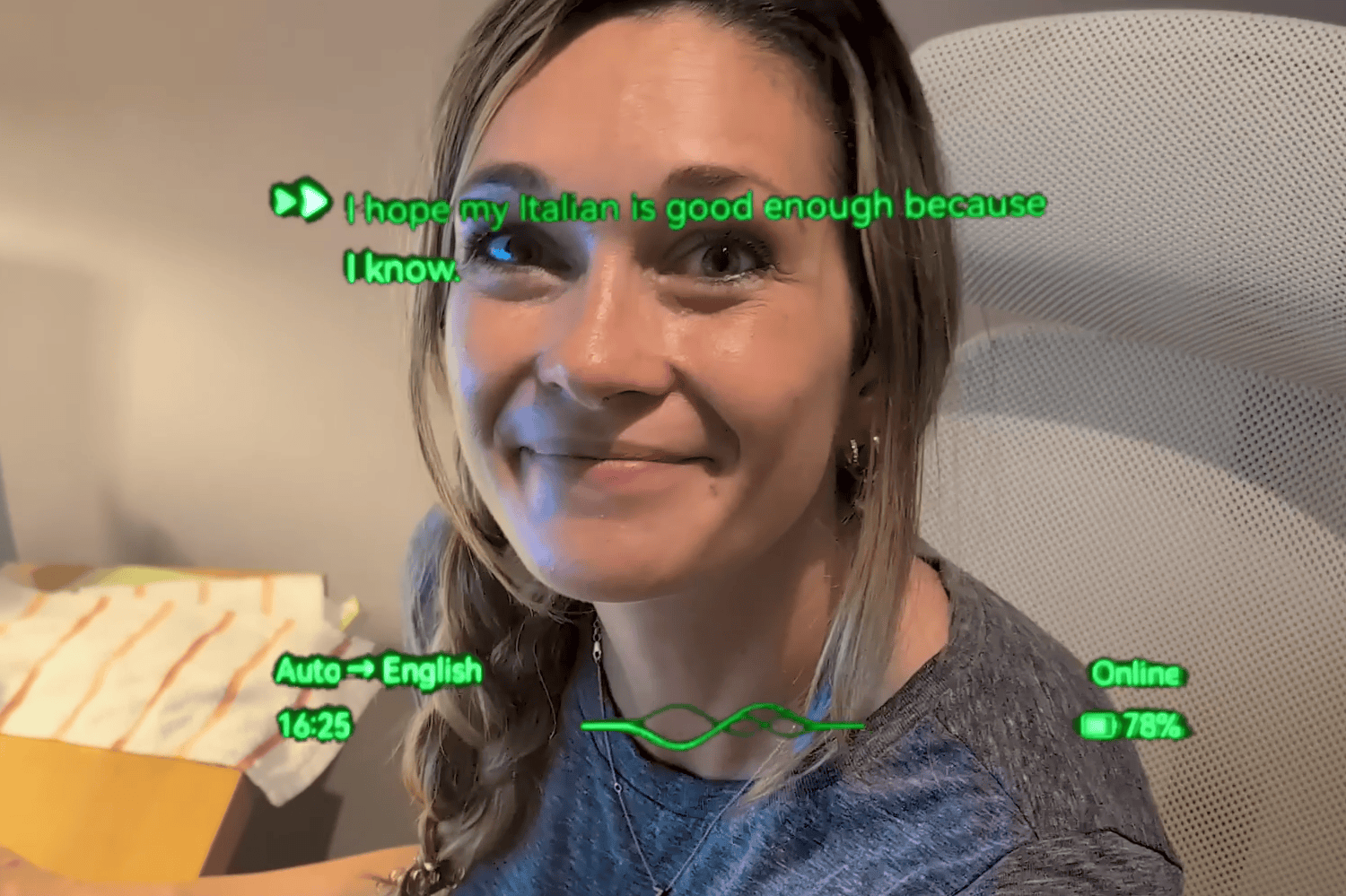 实时翻译则支持了“双向翻译”,对方的语言可以实时呈现在眼镜屏幕上,而我们所说的话则可以通过手机App转化为对方的语言,让对方一目了然地看懂,双向沟通彻底打通。