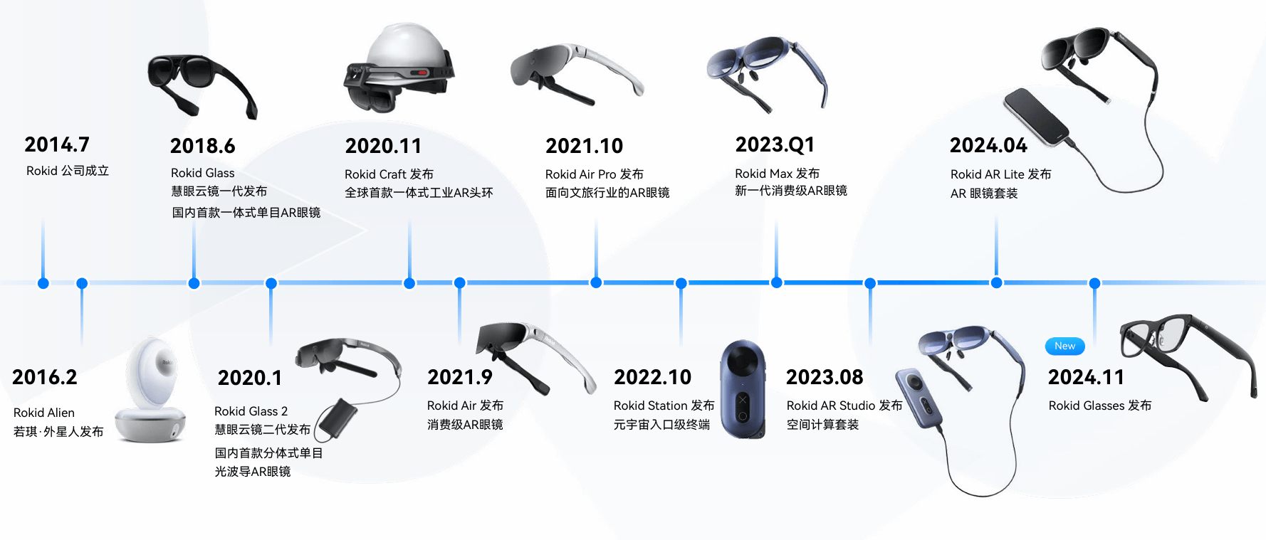 从早年的一体式AR眼镜、全栈开源XR操作系统Yodaos,到国内首款分体式单目光波导AR眼镜、消费级AR智能眼镜,再到如今的消费级AR+AI眼镜,Rokid对新技术的探索一直处于行业头部。