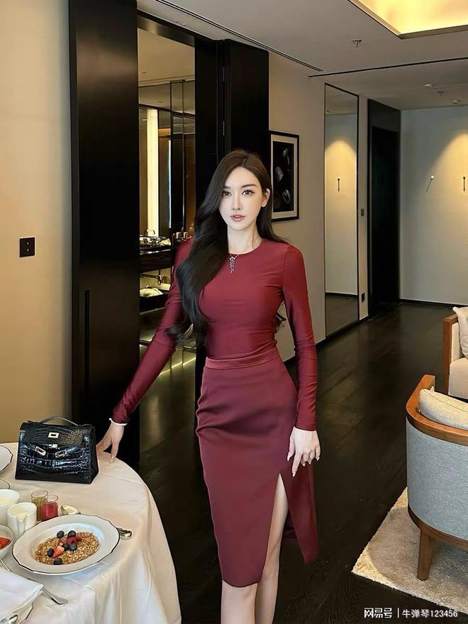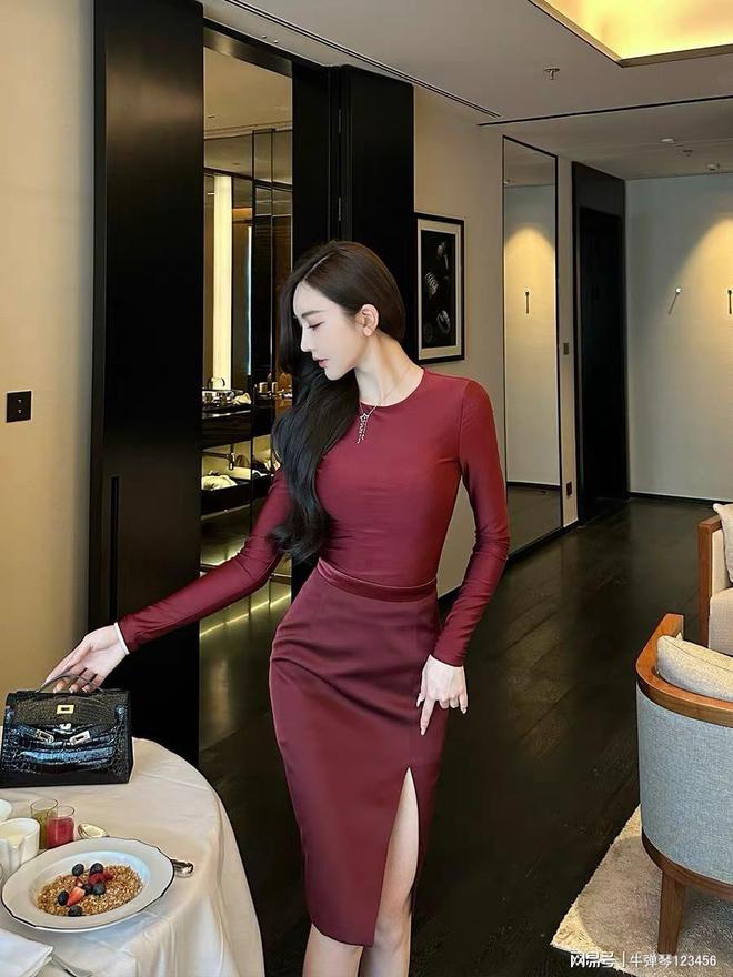 就像设计师Rebecca Minkoff说过的那句,“真正的风格不在于你穿了什么,而在于你怎么穿。”名媛风穿搭的精髓,就是那种不经意的优雅,不刻意却显贵。酒红色的紧身连衣裙真是yyds,显身材还不老气,长袖设计既能遮肉还显得挺优雅,侧边开个衩走路时微微露腿,若隐若现的超级有女人味。