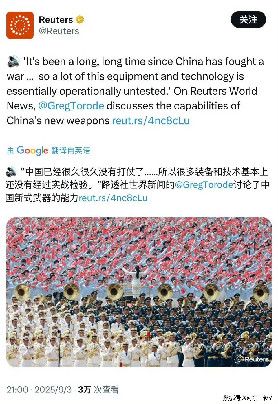 中国一场高规格阅兵,把整个西方舆论都调动起来,不为别的就是展示装备太过先进,西方自以为是的优越感瞬间没了。明显不服气但装备上的差距却是现实,于是他们换个角度找理由来抹黑,比如路透社称:中国已经很久很久没打仗了,所以很多武器和技术基本没有经过实战检验。